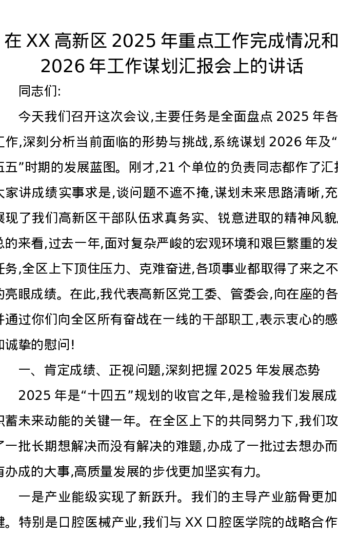 在XX高新区2025年重点工作完成情况和2026年工作谋划汇报会上的讲话