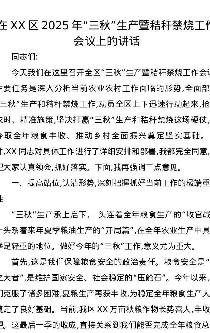在XX区2025年“三秋”生产暨秸秆禁烧工作会议上的讲话