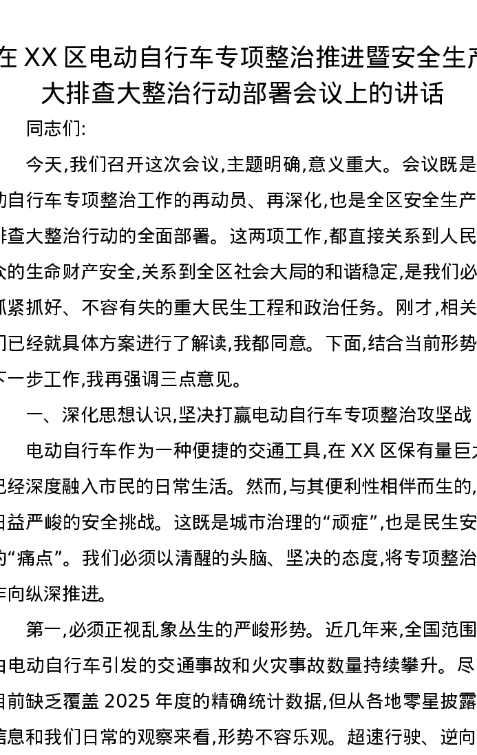 在XX区电动自行车专项整治推进暨安全生产大排查大整治行动部署会议上的讲话