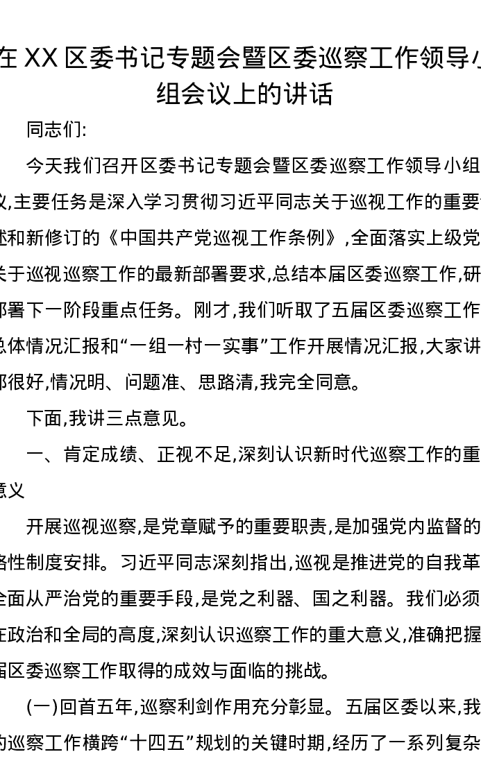 在XX区委书记专题会暨区委巡察工作领导小组会议上的讲话
