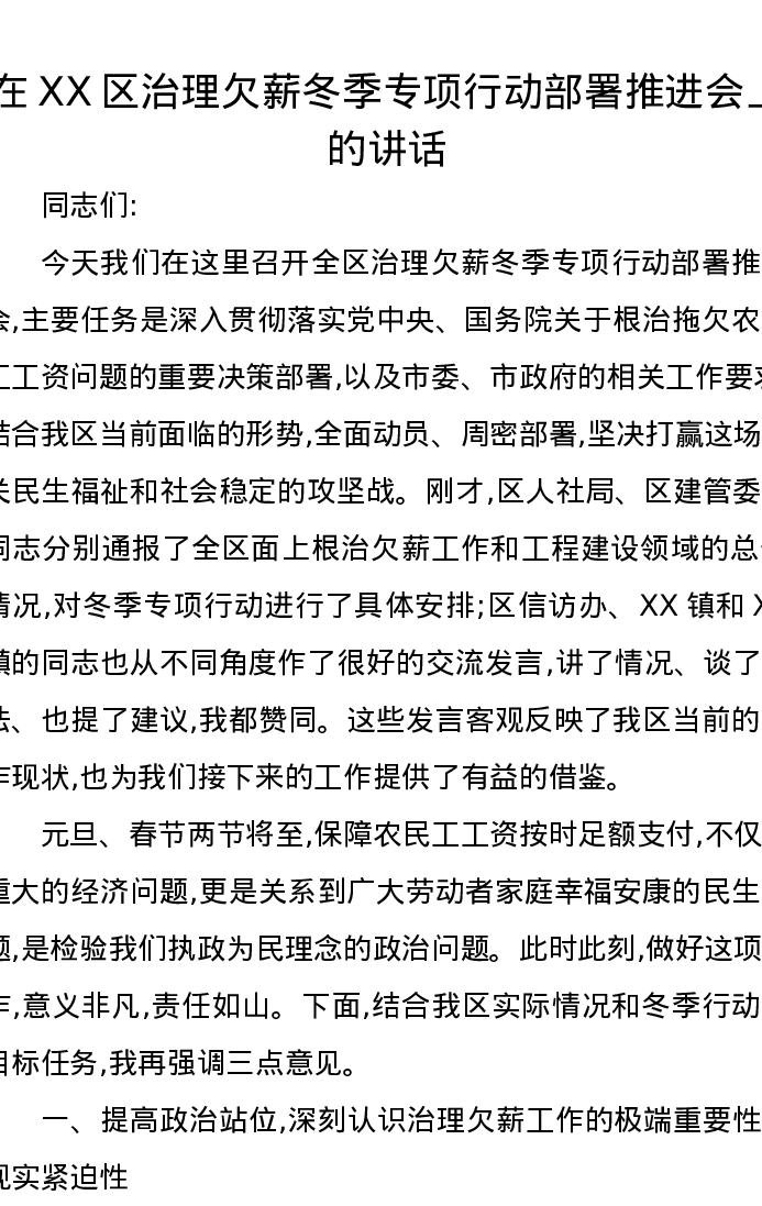 在XX区治理欠薪冬季专项行动部署推进会上的讲话