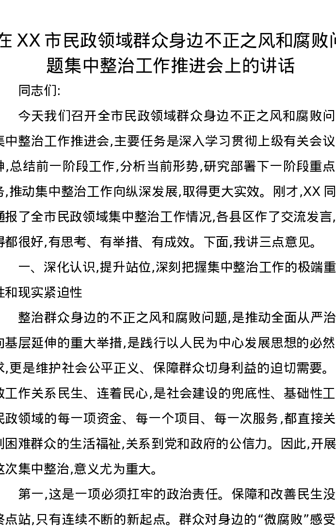 在XX市民政领域群众身边不正之风和腐败问题集中整治工作推进会上的讲话