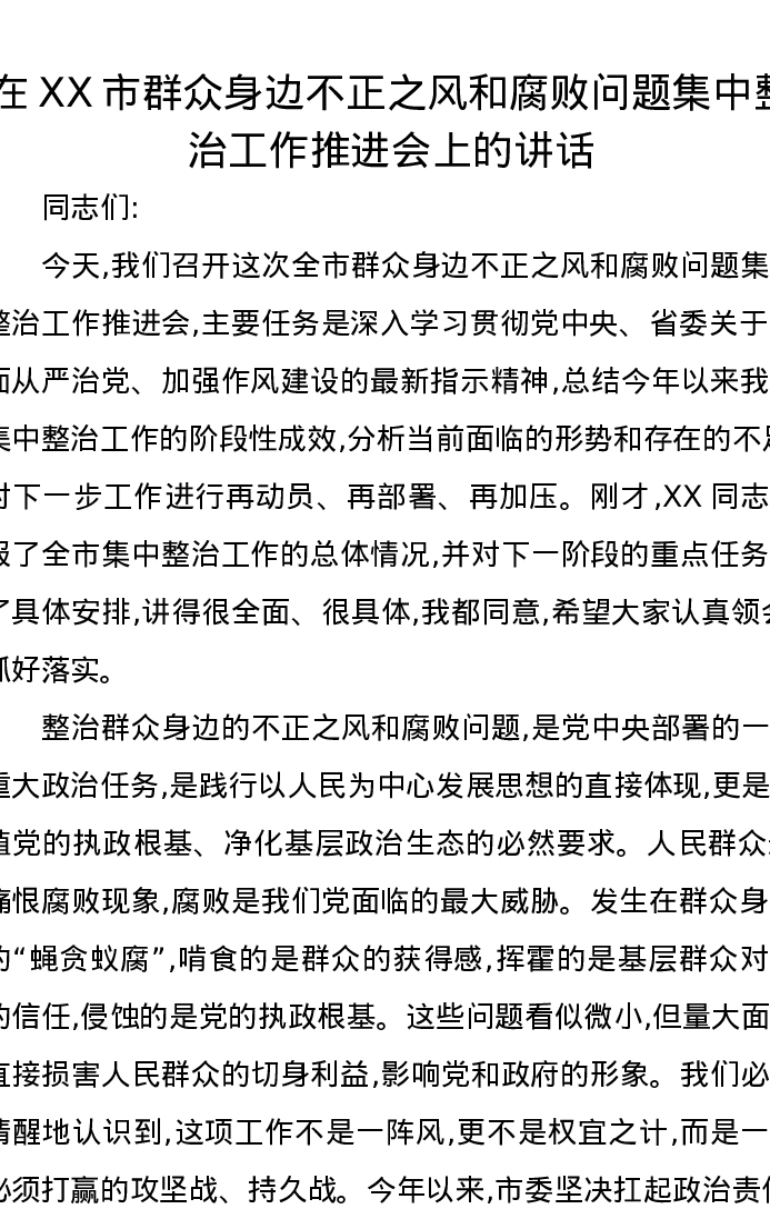 在XX市群众身边不正之风和腐败问题集中整治工作推进会上的讲话