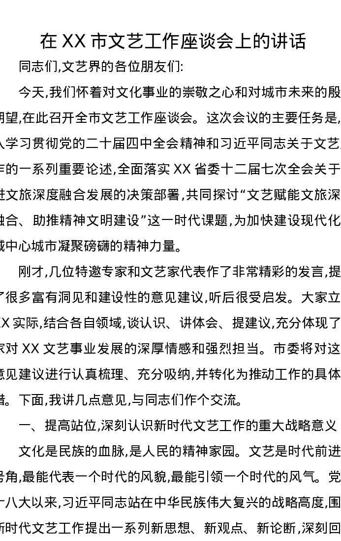 在XX市文艺工作座谈会上的讲话