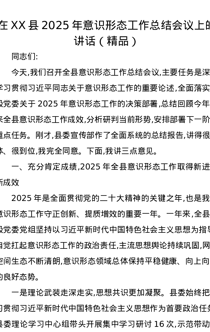 在XX县2025年意识形态工作总结会议上的讲话(精品)