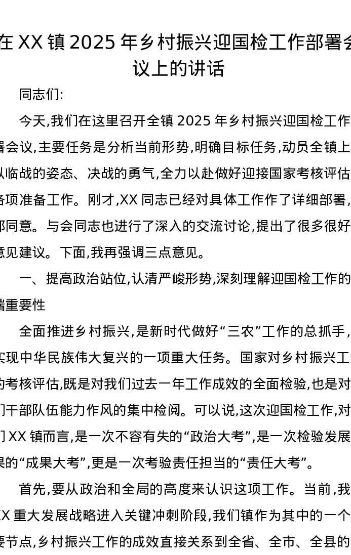 在XX镇2025年乡村振兴迎国检工作部署会议上的讲话