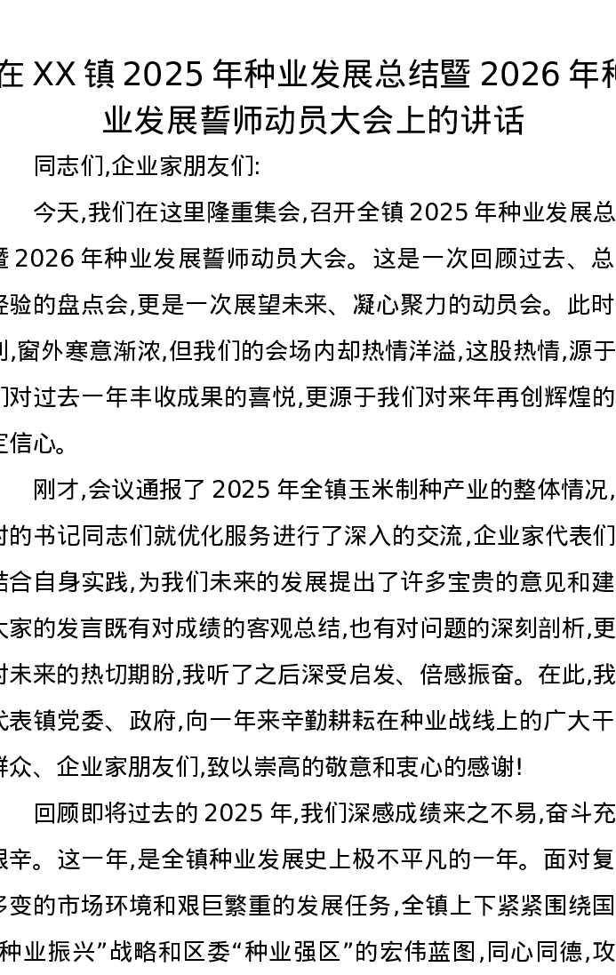 在XX镇2025年种业发展总结暨2026年种业发展誓师动员大会上的讲话