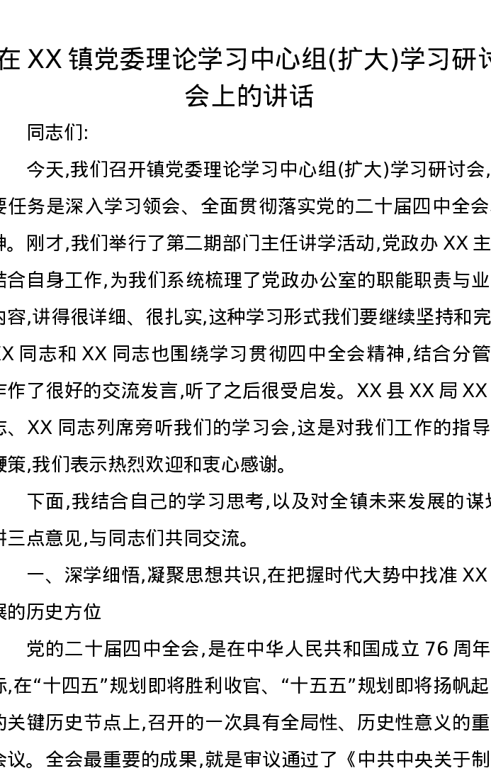 在XX镇党委理论学习中心组(扩大)学习研讨会上的讲话