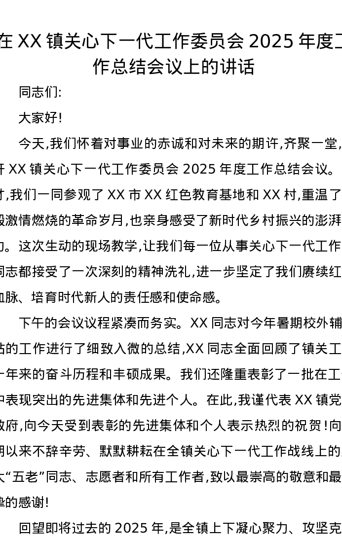 在XX镇关心下一代工作委员会2025年度工作总结会议上的讲话