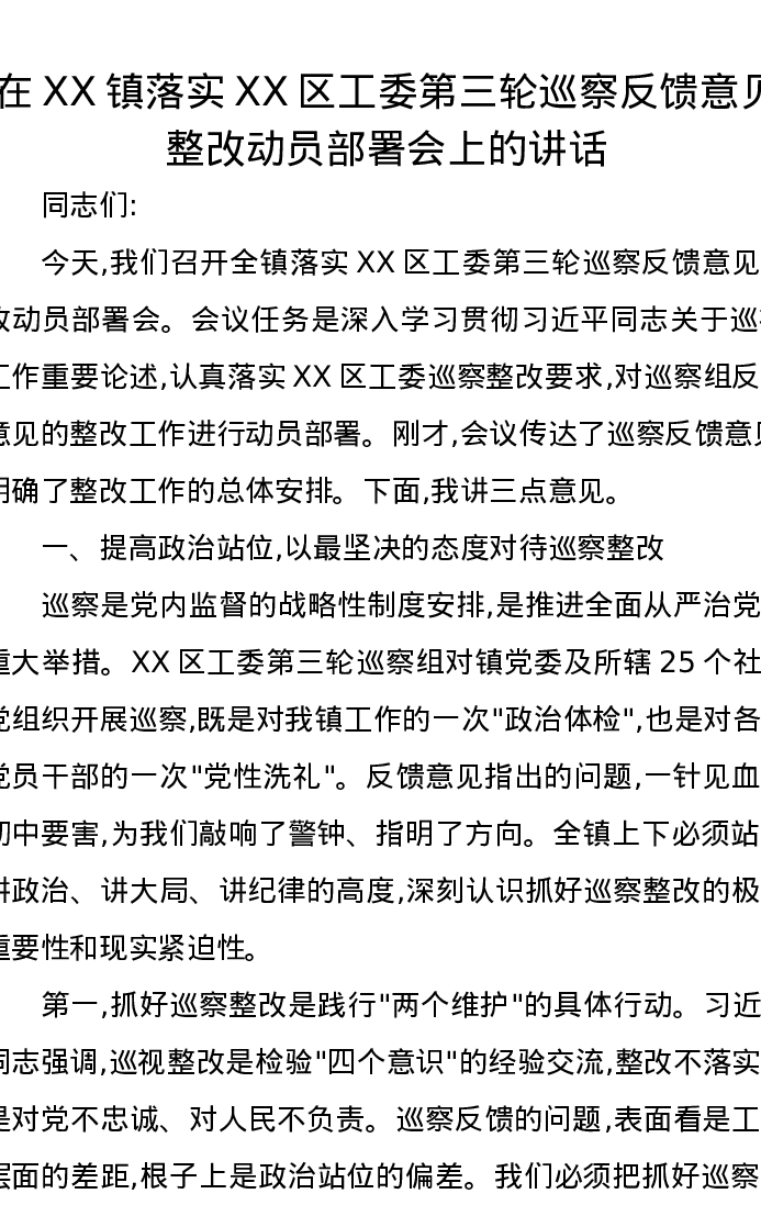 在XX镇落实XX区工委第三轮巡察反馈意见整改动员部署会上的讲话