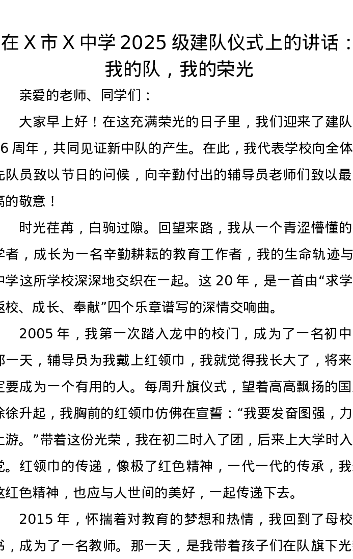 在X市X中学2025级建队仪式上的讲话:我的队,我的荣光