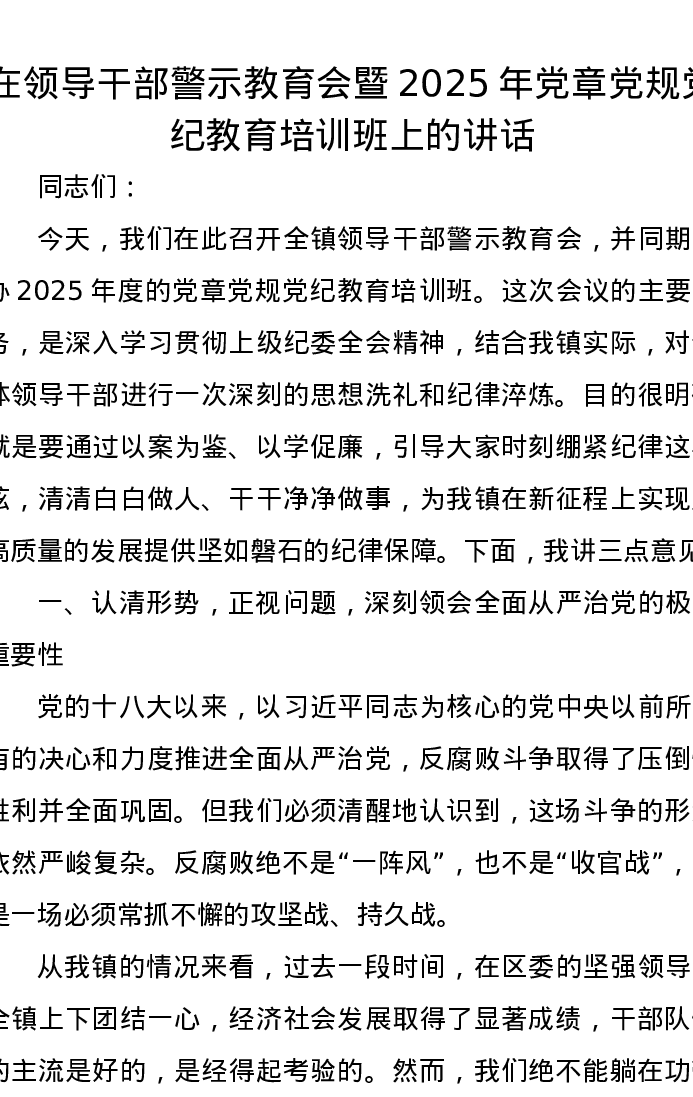 在领导干部警示教育会暨2025年党章党规党纪教育培训班上的讲话