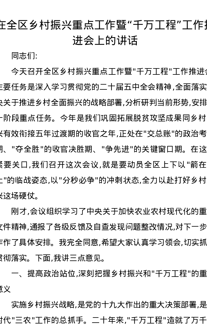 在全区乡村振兴重点工作暨“千万工程”工作推进会上的讲话