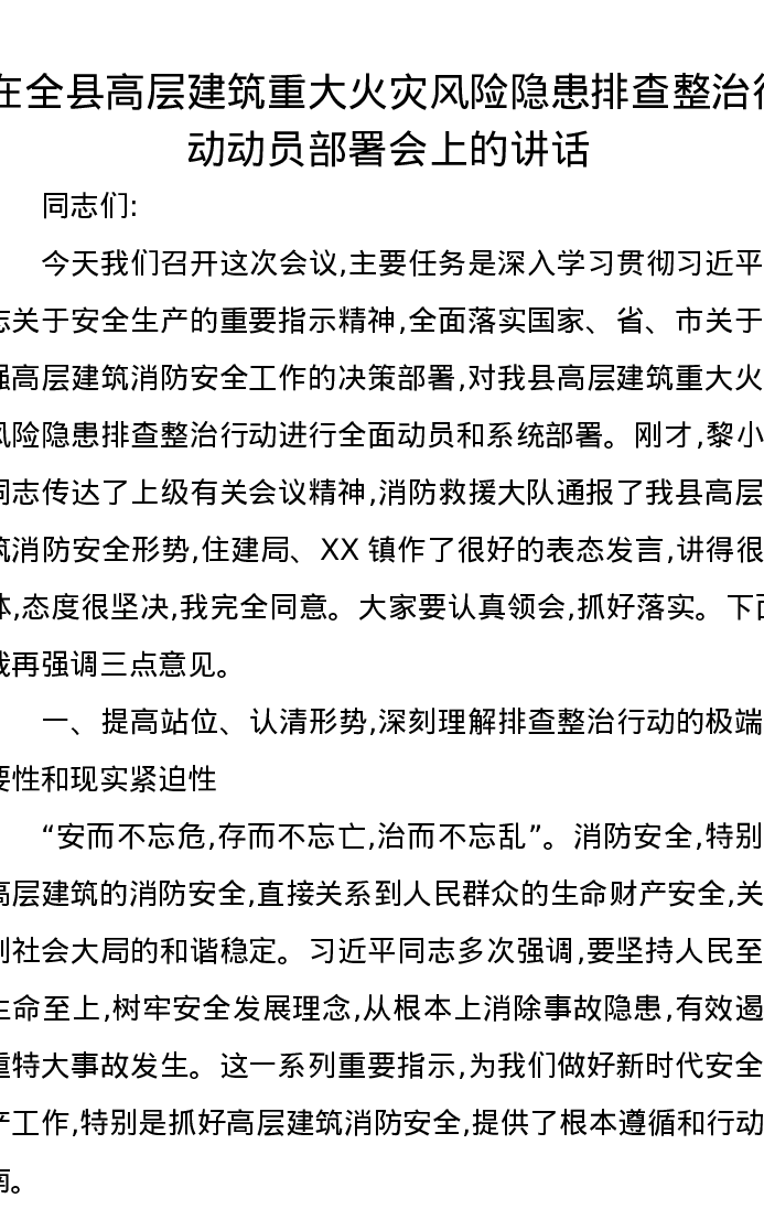 在全县高层建筑重大火灾风险隐患排查整治行动动员部署会上的讲话