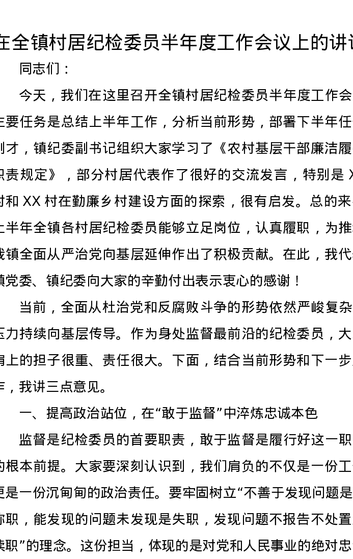 在全镇村居纪检委员半年度工作会议上的讲话