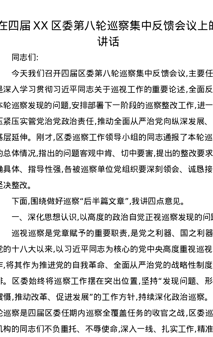 在四届XX区委第八轮巡察集中反馈会议上的讲话