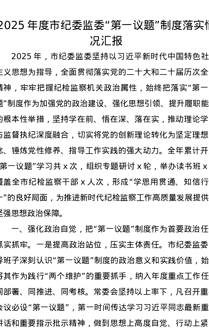 2025年度市纪委监委“第一议题”制度落实情况汇报