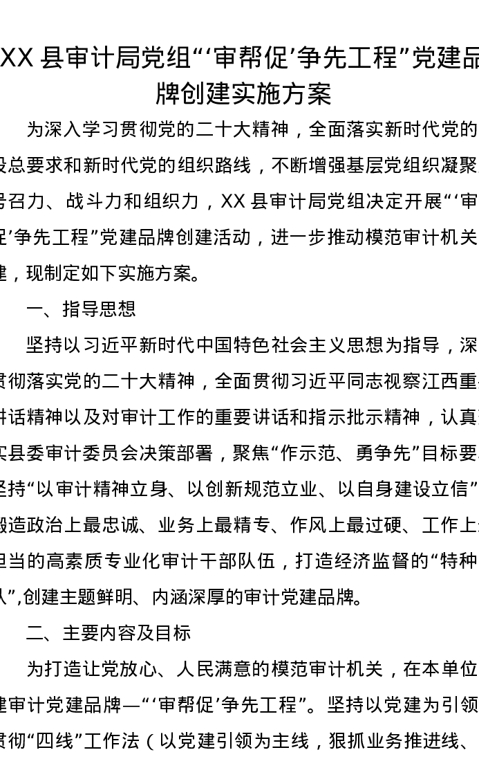 XX县审计局党组“‘审帮促’争先工程” 党建品牌创建实施方案