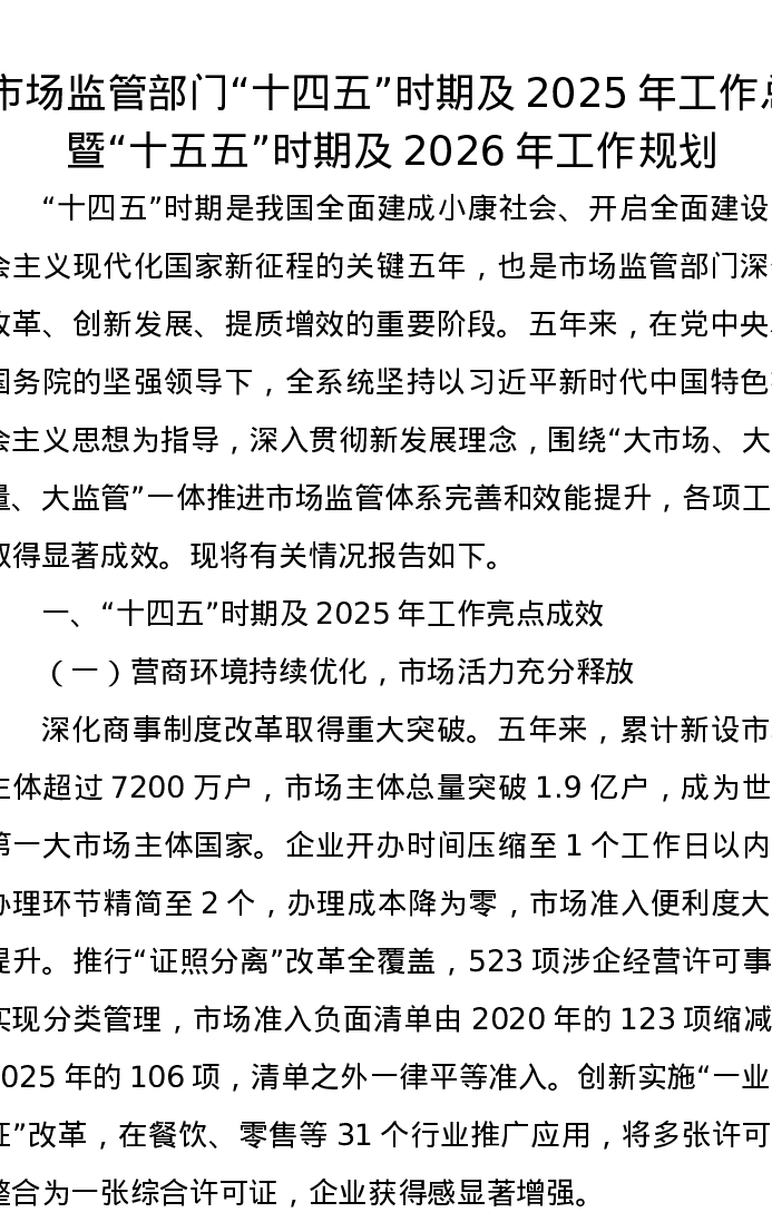 市场监管部门“十四五”时期及2025年工作总暨“十五五”时期及2026年工作规划