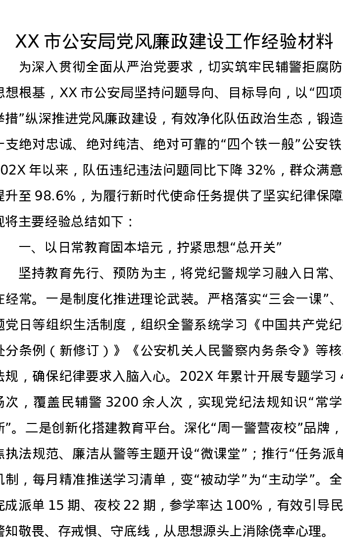 XX市公安局党风廉政建设工作经验材料