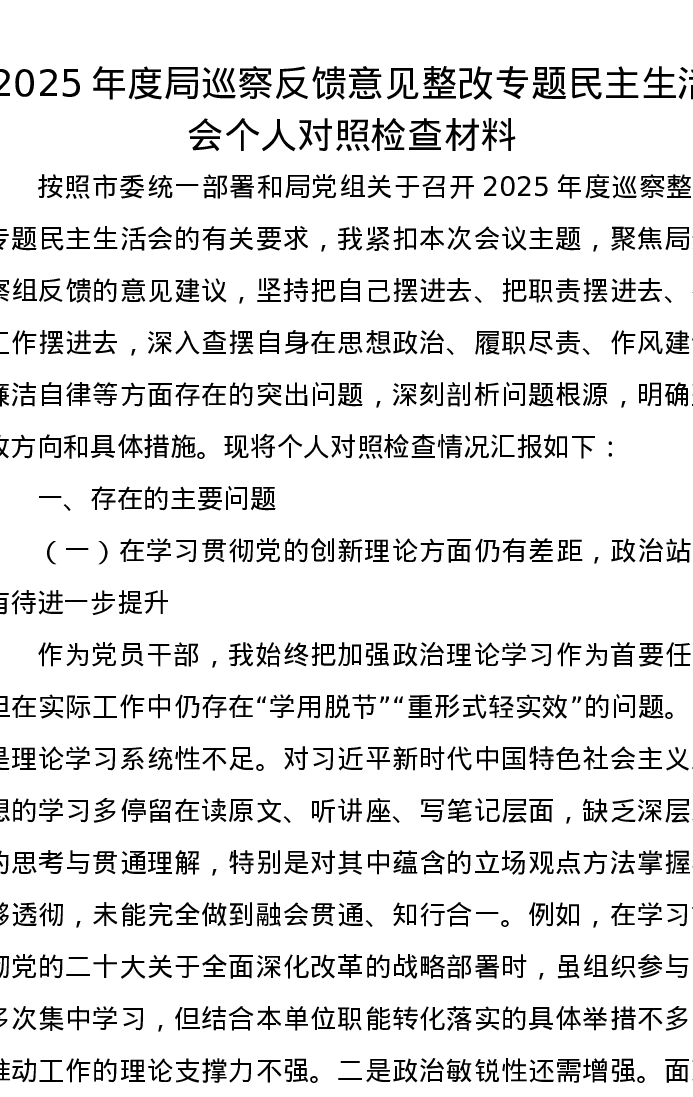 2025年度局巡察反馈意见整改专题xxxxx个人对照检查材料