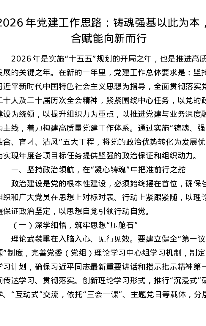 2026年党建工作思路:铸魂强基以此为本,融合赋能向新而行