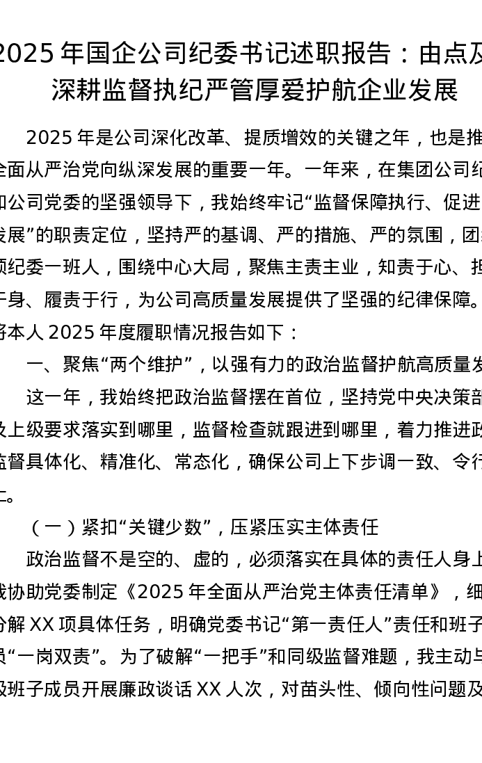 2025年国企公司纪委书记述职报告:由点及面深耕监督执纪 严管厚爱护航企业发展