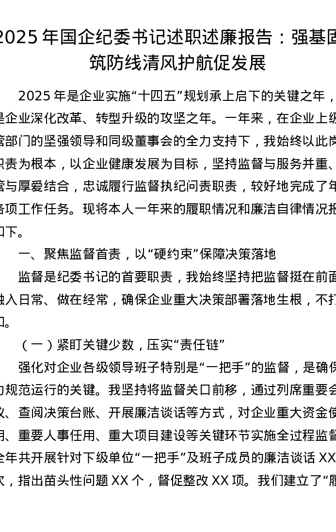 2025年国企纪委书记述职述廉报告:强基固本筑防线 清风护航促发展