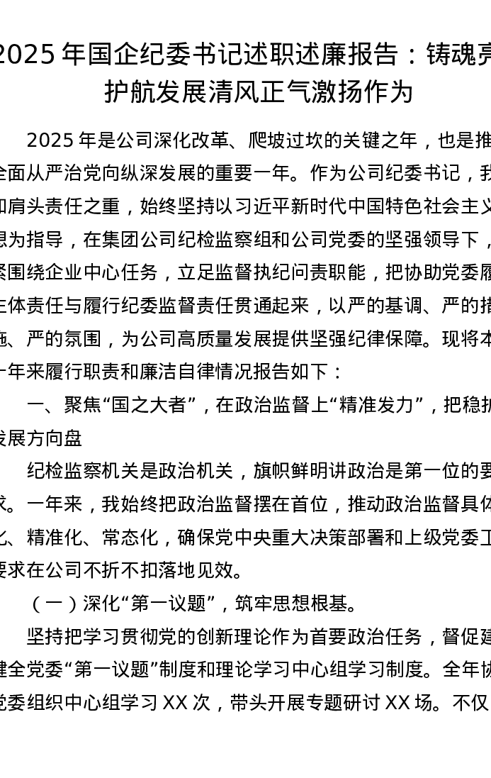 2025年国企纪委书记述职述廉报告:铸魂亮剑护航发展 清风正气激扬作为