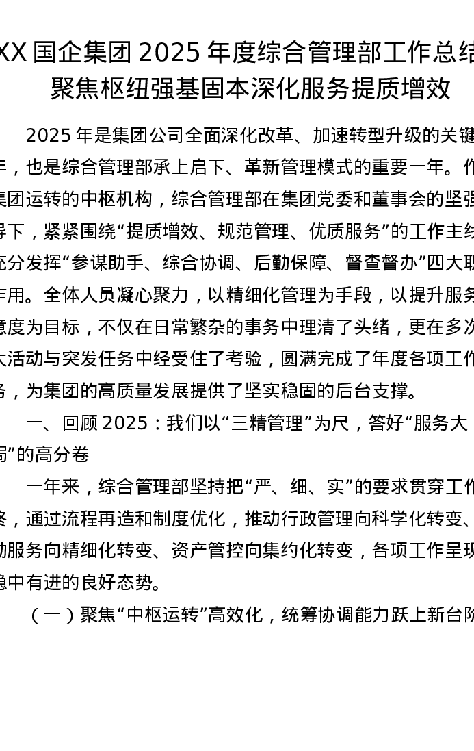 XX国企集团2025年度综合管理部工作总结:聚焦枢纽强基固本 深化服务提质增效