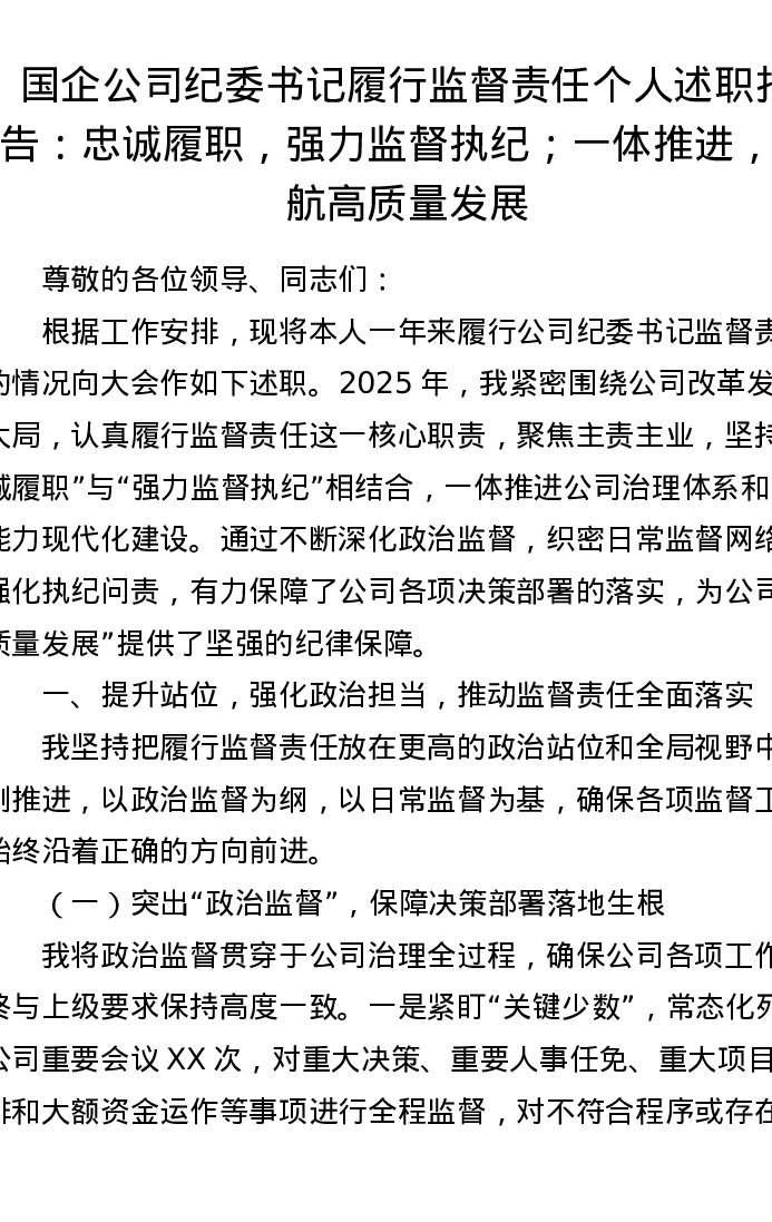 国企公司纪委书记履行监督责任个人述职报告:忠诚履职,强力监督执纪;一体推进,护航高质量发展
