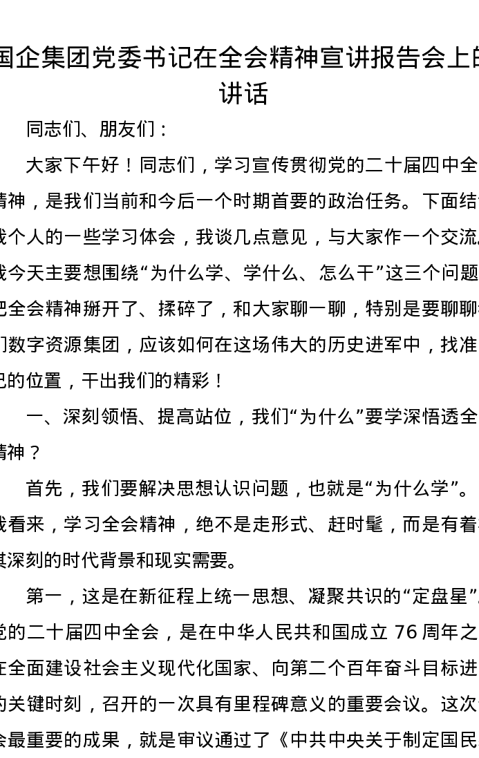 国企集团党委书记在全会精神宣讲报告会上的讲话
