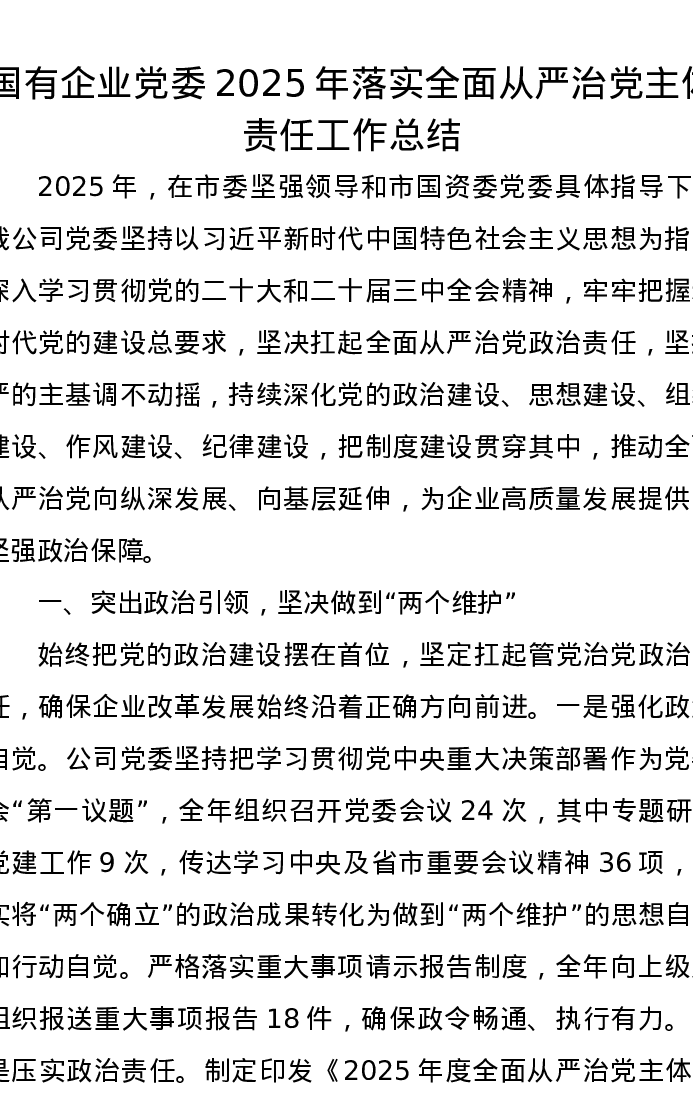 国有企业党委2025年落实全面从严治党主体责任工作总结