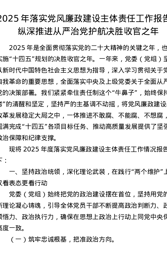 2025年落实党风廉政建设主体责任工作报告:纵深推进从严治党 护航决胜收官之年