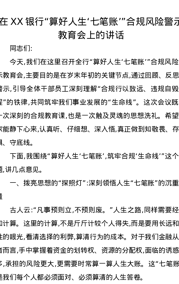 在XX银行“算好人生‘七笔账’”合规风险警示教育会上的讲话