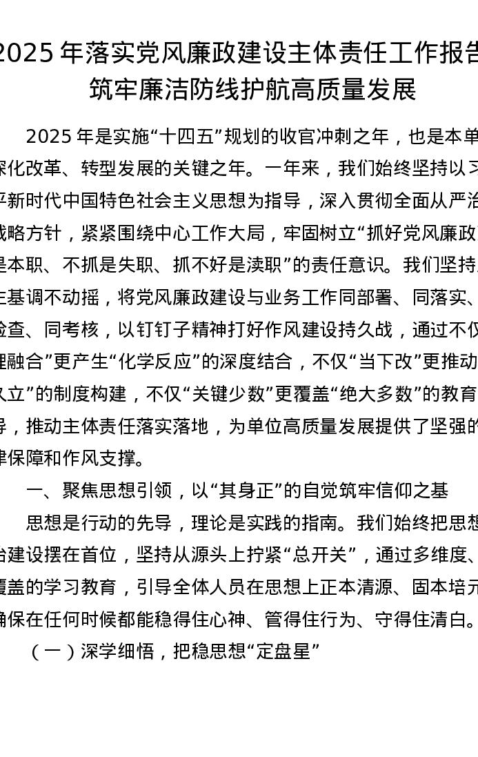 2025年落实党风廉政建设主体责任工作报告:筑牢廉洁防线 护航高质量发展