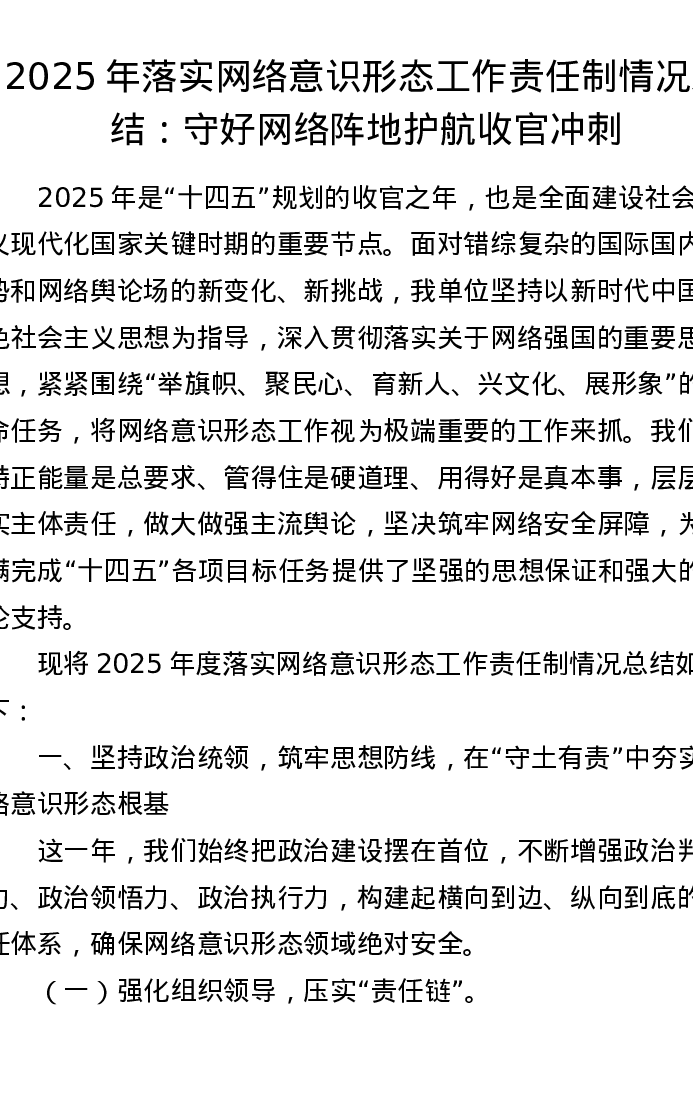 2025年落实网络意识形态工作责任制情况总结:守好网络阵地 护航收官冲刺