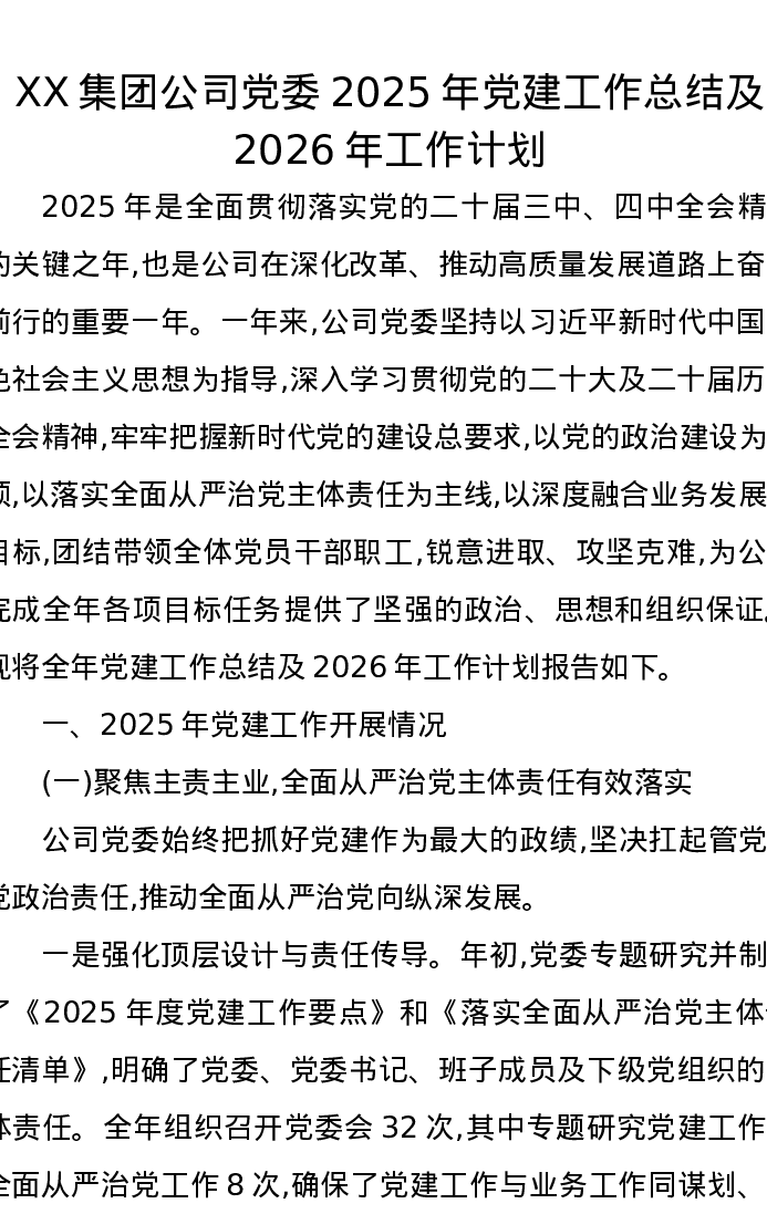 XX集团公司党委2025年党建工作总结及2026年工作计划