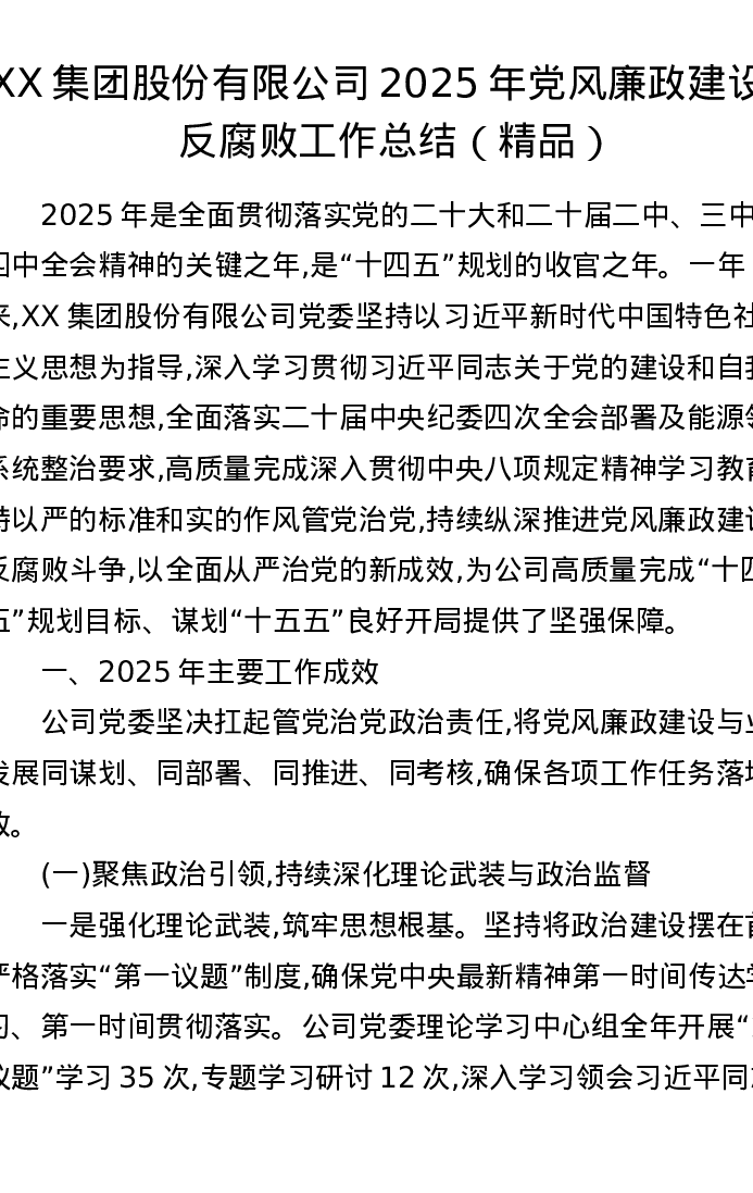 XX集团股份有限公司2025年党风廉政建设和反腐败工作总结