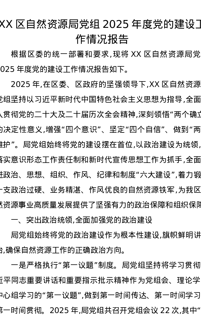 XX区自然资源局党组2025年度党的建设工作情况报告