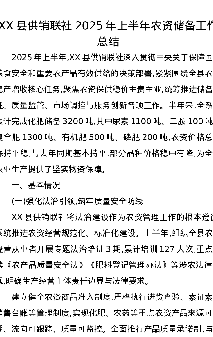 XX县供销联社2025年上半年农资储备工作总结
