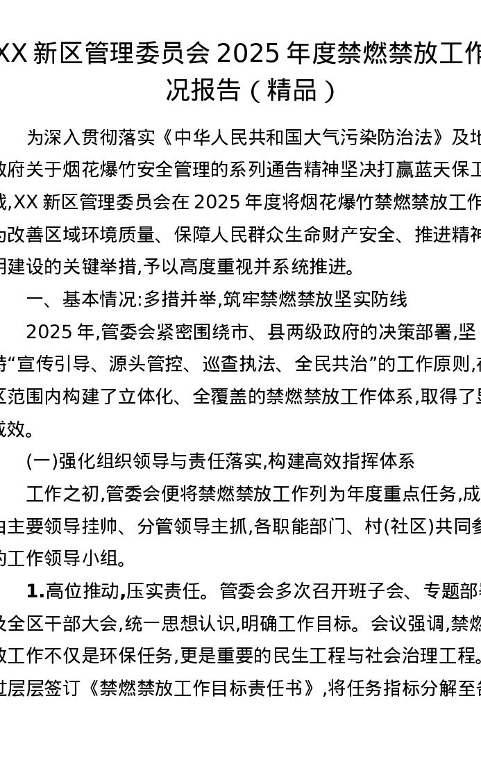 XX新区管理委员会2025年度禁燃禁放工作情况报告