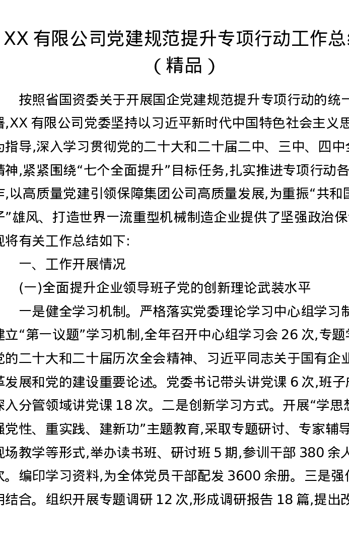 XX有限公司党建规范提升专项行动工作总结