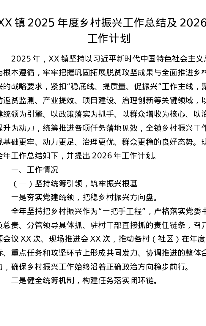 XX镇2025年度乡村振兴工作总结及2026年工作计划(4397字)