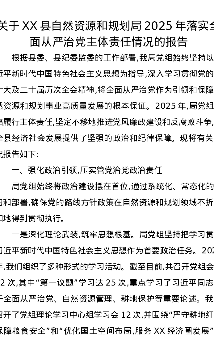 关于XX县自然资源和规划局2025年落实全面从严治党主体责任情况的报告