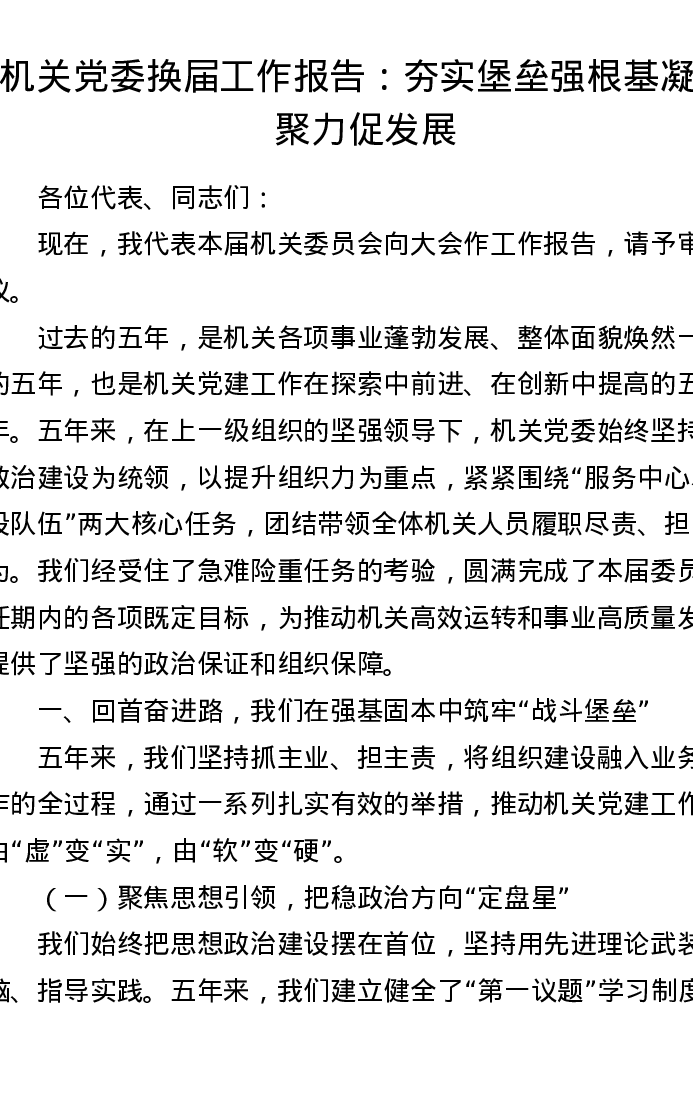 机关党委换届工作报告:夯实堡垒强根基 凝心聚力促发展