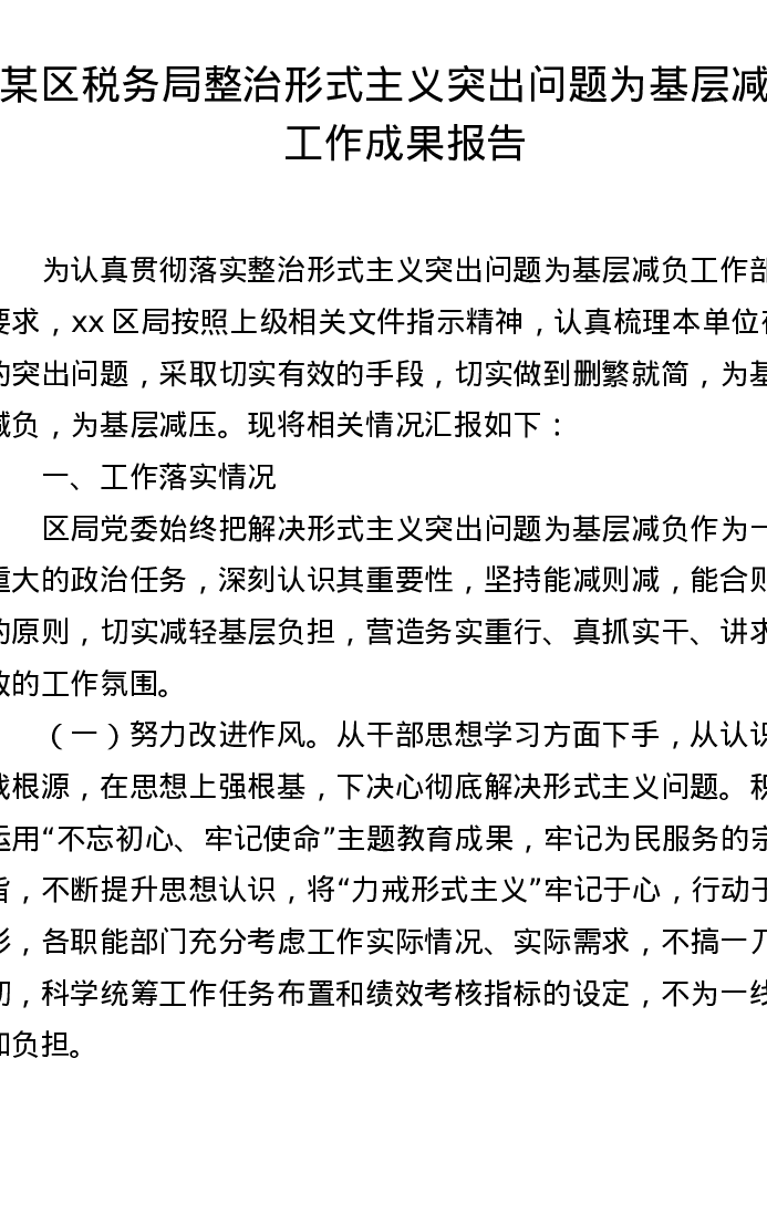 某区税务局整治形式主义突出问题为基层减负工作成果报告