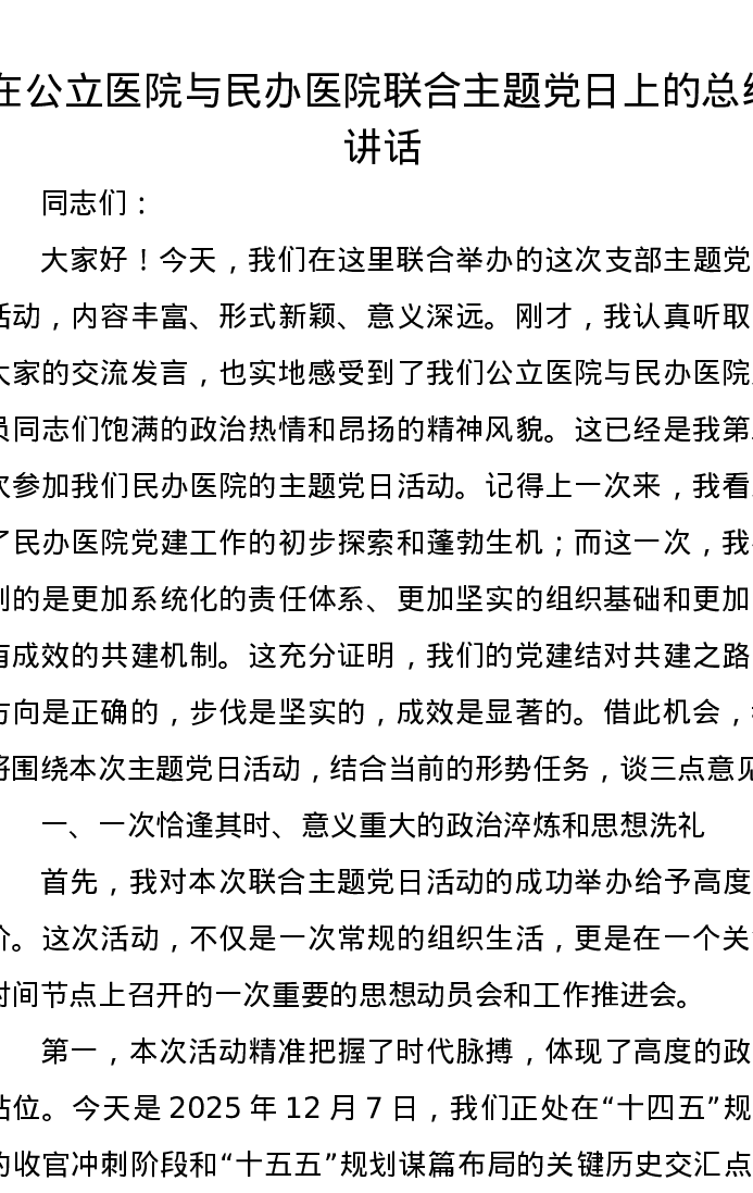 凝心聚力担使命,医心向党谱新篇——在公立医院与民办医院联合主题党日上的总结讲话