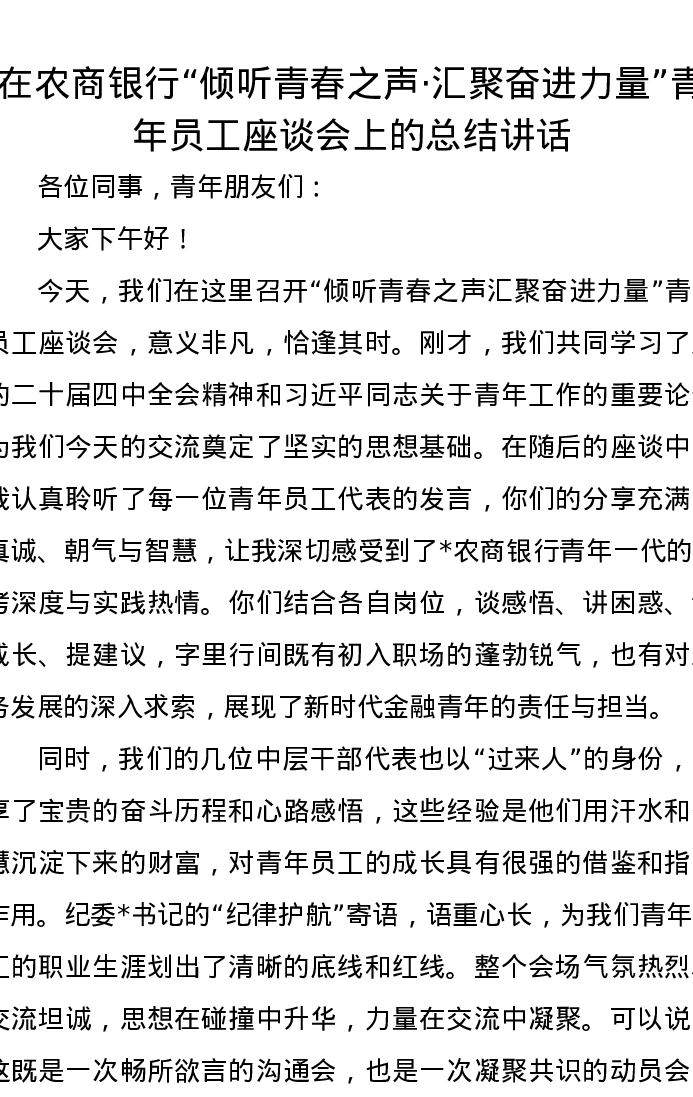 在农商银行“倾听青春之声·汇聚奋进力量”青年员工座谈会上的总结讲话