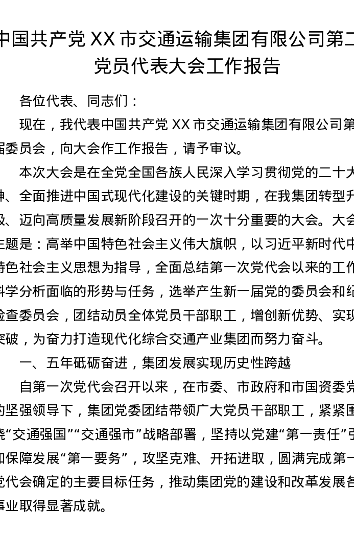 中国共产党XX市交通运输集团有限公司第二次党员代表大会工作报告